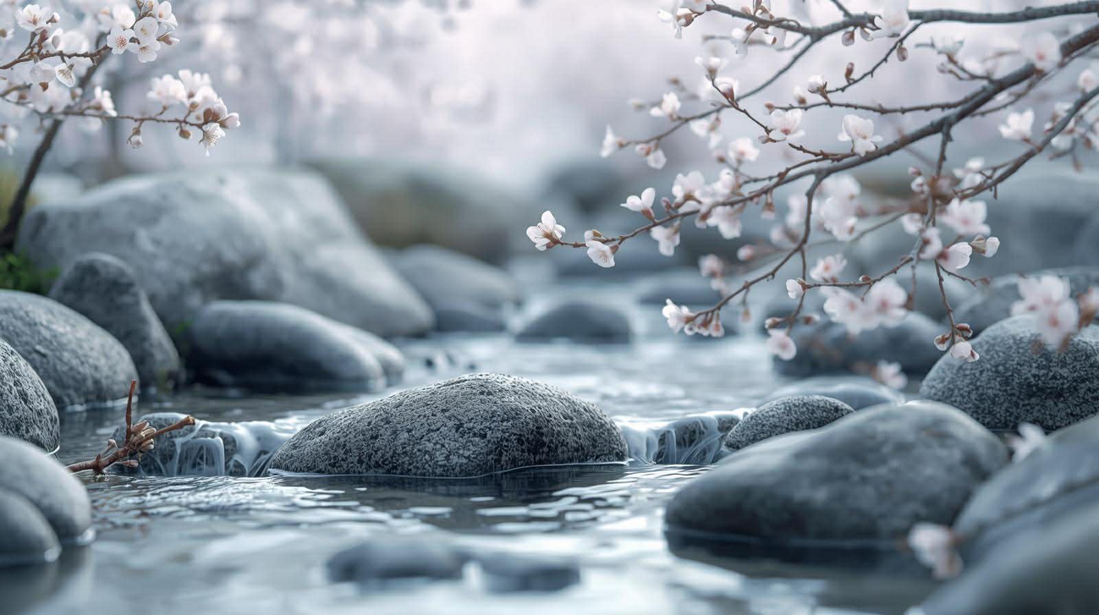 Explore the serene beauty of flowers on tree branches cascading over a tranquil brook, evoking nostalgia and the charm of nature’s embrace.